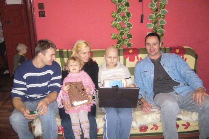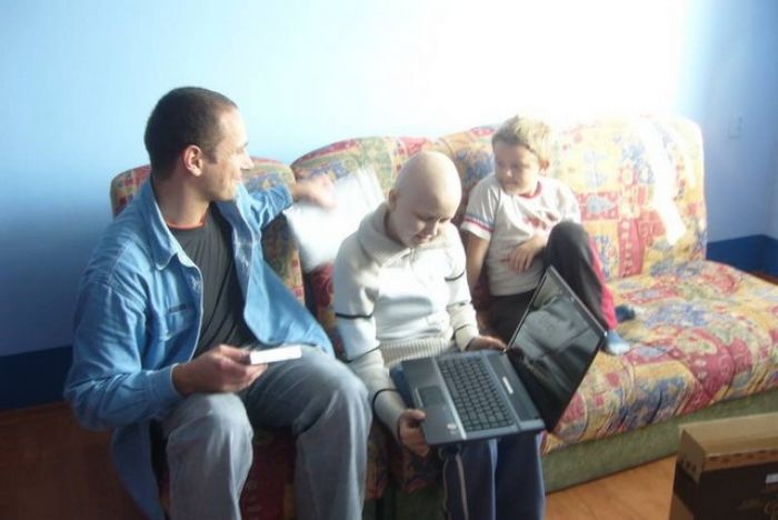 Weronika było nieco onieśmielona naszą wizytą. Nie wiedziała, że przyjedziemy, gdyż rodzina utrzymała to przed nią w tajemnicy:-) Zjawiła się również telewizja, aby nakręcić przekazanie laptopa dziewczynce, toteż nic dziwnego, że Weronika była troszkę stremowana. Grzesiek zajął się z Weroniką instalowaniem internetu i kamerki, ja w tym czasie mogłam porozmawiać z mamą Weroniki - Panią Renatą i siostrą - Natalką, które odpowiedziały mi o codziennych problemach, podczas gdy po pokoju hasała młodsza siostra Wiktoria i siostrzeniec-łobuziak Kubuś. Zostaliśmy również poczęstowani przepysznym ciastem (tak dobrego sernika dawno nie jadłam!), wpisaliśmy się do Księgi Życzeń Weroniki i zrobiliśmy sobie pamiątkowe zdjęcia.