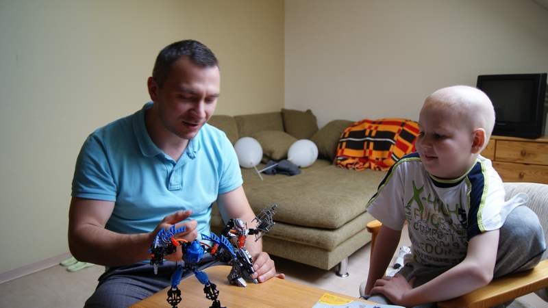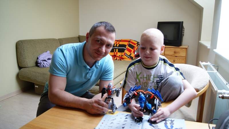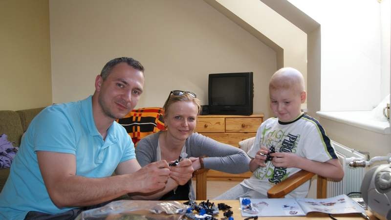 W słoneczne czwartkowe popołudnie wybraliśmy się razem z Anią i Radkiem do Szpitala na Unię Lubelską, aby poznać naszego nowego Marzyciela - 9 - letniego Łukasza. Wyjątkowo mieliśmy mały problem żeby trafić na miejsce, ale na szczęście Marzyciel razem ze swoją Mamą wyszli na naprzeciw :) Przeprowadzając "wywiad" na temat zainteresowań Łukasza, dowiedzieliśmy się że chlopiec ma sporą kolekcję Lego, dlatego jako lodołamacz wybraliśmy klocki. Na nasze szczęście Łukasz jeszcze takich nie mial, dlatego bardzo się ucieszył z upominku. Co zresztą widać na zdjęciach; Radek z Łukaszem mieli niezłą zabawę tworząc roboty z klocków :) Wizyta przebiegała w miłej i sympatycznej atmosferze. Dowiedzieliśmy się, że Łukasz lubi wędrówki po lesie, w czasie których zbiera jagody oraz łowić ryby. Ma także niemała gromadkę psiaków. Marzyciel dokładnie wiedział, w jakim celu przyszliśmy. Poproszony o to, aby nam "coś" narysował- ponieważ to także lubi robić, narysował swoje marzenie! Łukasz marzy o komputerze stacjonarnym, na którym mógłby grać oraz dzieki któremu miałby kontakt ze znajomymi. Byliśmy pod wrażeniem precyzji rysunku Łukasza, na którym znalazła się nie tylko klawiatura, ale również myszka do komputera.Łukaszu, postaramy się abyś niedługo mógł cieszyc się swoim wymarzonym komputerem!